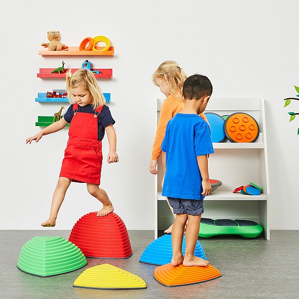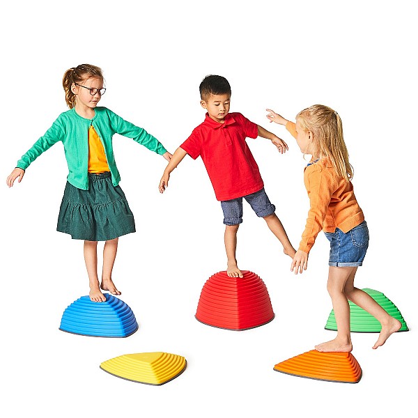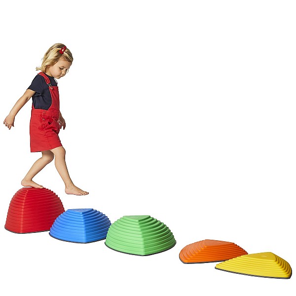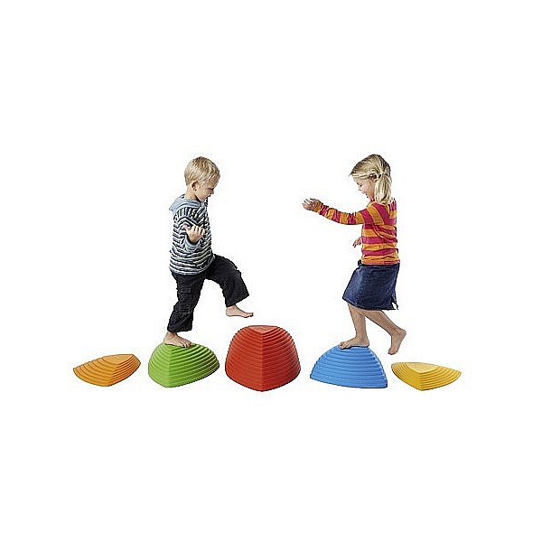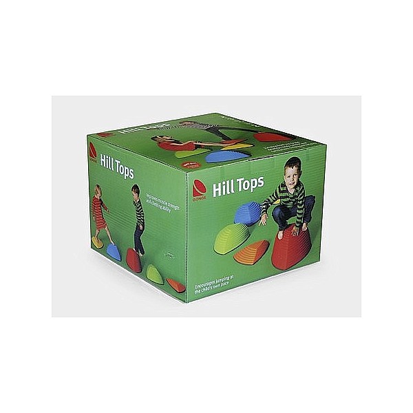 Set of 5 different heights, colored hilltops made of durable plastic, prevents non-slip rubber edge, the slipping and protects the floor from scratches. The domes are designed so that they can not overturn. The different heights of the hilltops encourage children from tip to jump to tip, they assess the ability to learn distances properly and make the same familiar with different heights. Balance, body awareness, coordination and motor skills are trained playfully. Recommended for children from 2 years. Total weight about 4.80 kg. For storing practically stackable. Maximum load 100 kg. The stackable set consists of 5 peaks: 1 peaks (L x B x H) 42 x 42 x 25,5 cm 2 peaks (L x B x H) 40.5 x 40.5 x 17 cm 2 peaks (L x W x H) 36 x 36 x 8.5 cm Provided instructions.
