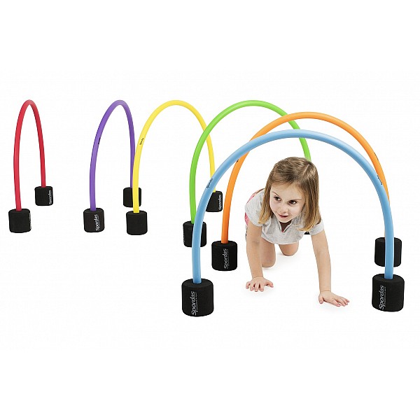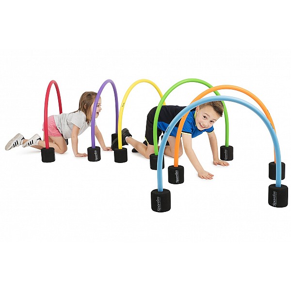 The crawling bow set can be used in many ways as a crawling or obstacle parkour and as goals for ball games. The arches can be put into the matching bases by the children themselves and set up as a parkour. So that the fun can quickly begin. The height of the arches can be adjusted variably from 53 to 61 cm. Promote children's motor skills in daycare centres and in classrooms in a playful way with the crawling arch set of 6.