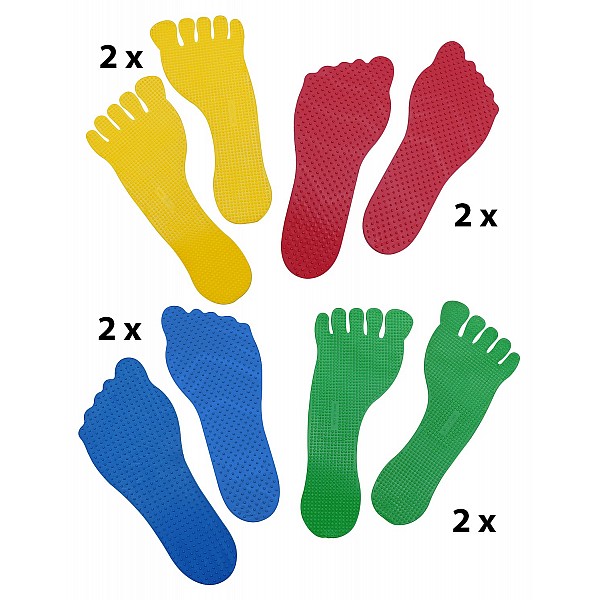 Use the colourful feet as floor markers for your methodical games in class or for learning exercises and techniques. Practical in a set of 16 as an aid for kindergartens, schools and clubs. The hard-wearing and non-slip feet are made of high-quality rubber. Thanks to the smooth back, there are no traces of glue on the floor. The delivery includes one left and one right foot. 1 pair (left and right foot) per colour