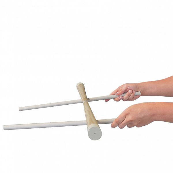 The Devil Stick Standard is a wooden stick that tapers conically towards the center. Plastic caps at the ends prevent the wood from splintering when dropped. With this neutral Devil Stick, players can decorate their Devil Stick as they see fit, using adhesive tape or color. The Devil Stick is kept in the air and set in rotation using two plastic-coated handsticks.