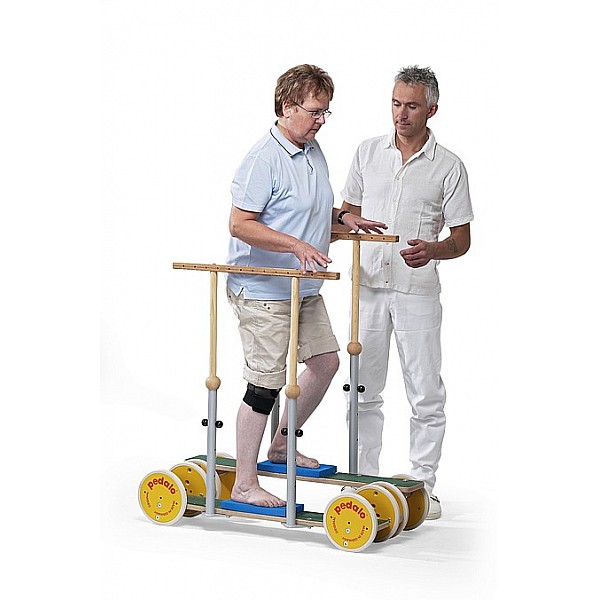 The bars pedalo S is adapted to the requirements of the therapy in its stable design and equipment. The spacers between the, white PVC-coated, wood wheels guarantee a wide, stable platform on 2 large birch multiplex running boards (100 x 14 cm).