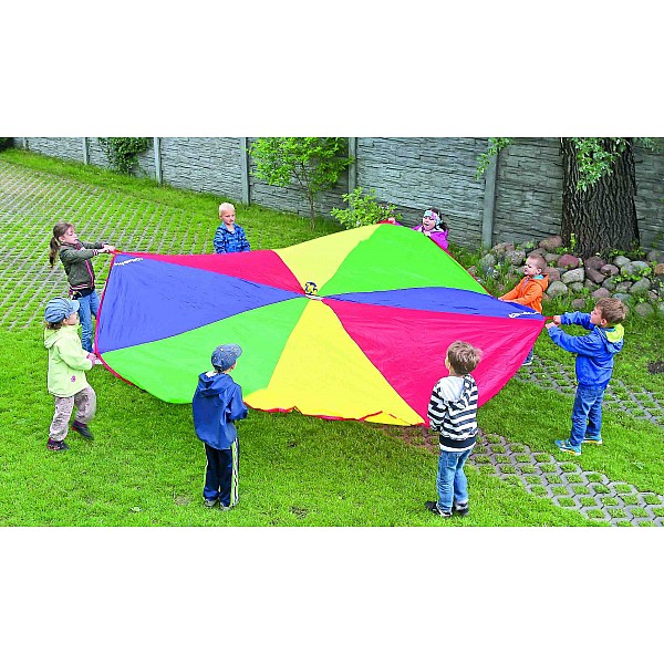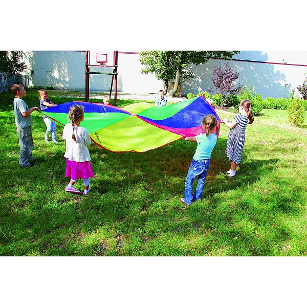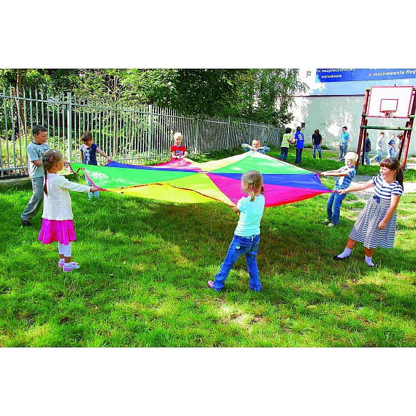 Parachute cloth made of nylon, on the edge with handles, in the middle a hole with cord closure. Ideally Group's products for active games in kindergarten, the elderly or infirm or for therapeutic applications.