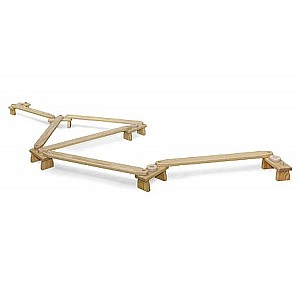The 17-piece set consists of 7 Balancierbrettern 110 x 9.5 cm, 6 Stand blocks (B x L x H) 30 x 16 x 15 cm, with 3 pins for fixing the balancing boards 4 and circular disks. This resulted in a 5 m long Balanciersteg can be built. Solid pine wood, natural finish.