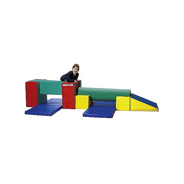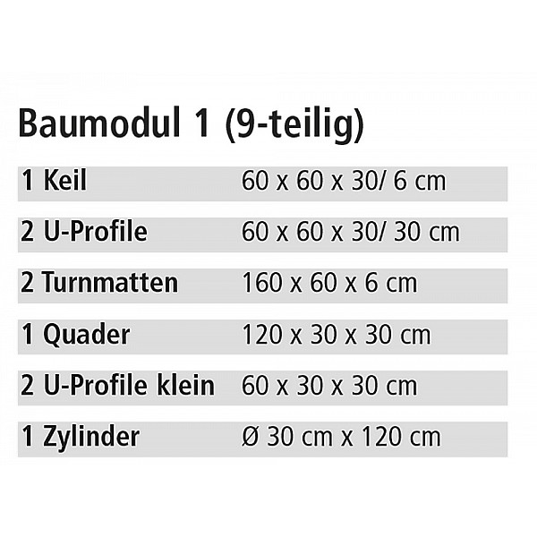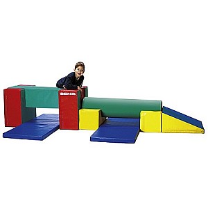 Colored light canvas material with solid foam core consisting of blocks, gymnastics mats, bridges, cylinders, U-profiles, and wedge.
