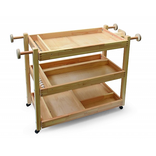 Gymnastics mobile trolley, incl.3 floors each 85 x 50 x 7.5 cm cm or 85th Includes 4 shelf brackets, two on each side, for hanging Hoop or lobes and stop motions of the rods. The three divided floors used for storage of large items such as gymnastics e.g rubber dumbbells, stability balls, rubber rings and or skipping ropes. Material: pine, birch