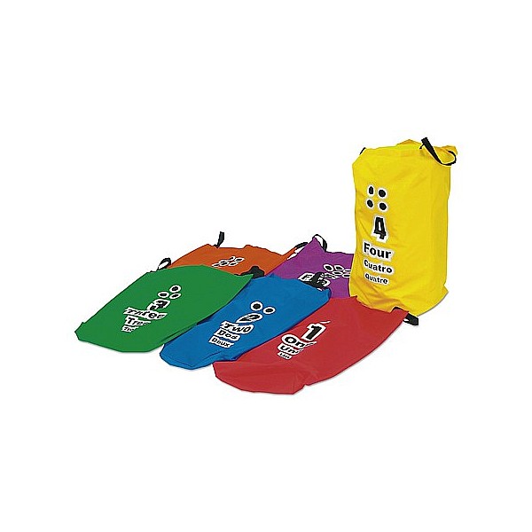 Hopsacks, 60 cm high, diameter 30cm. Set of 6 nylon with 2 sturdy handles. With numbers from 1-6, and 3-sprachigem print. Blue, red, yellow, green, orange and purple.