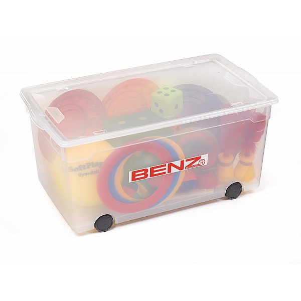 Comprising: storage box with wheels and lid (W x H x D) 71.5 x 35 x 40 cm 3 Spinning Plate with sticks 6 Jonglierbälle 1 Diabolo small 1 Diabolo medium 3 juggling rings Ø 24 cm 1 soft ball, yellow, Ø 20 cm 2 Tennis rings foam rubber 1 family tennis 2 Indiaca play 6 skipping ropes, each 2.60 m 1 foam cubes (16 x 16 x 16 cm) 1 Klett ball game