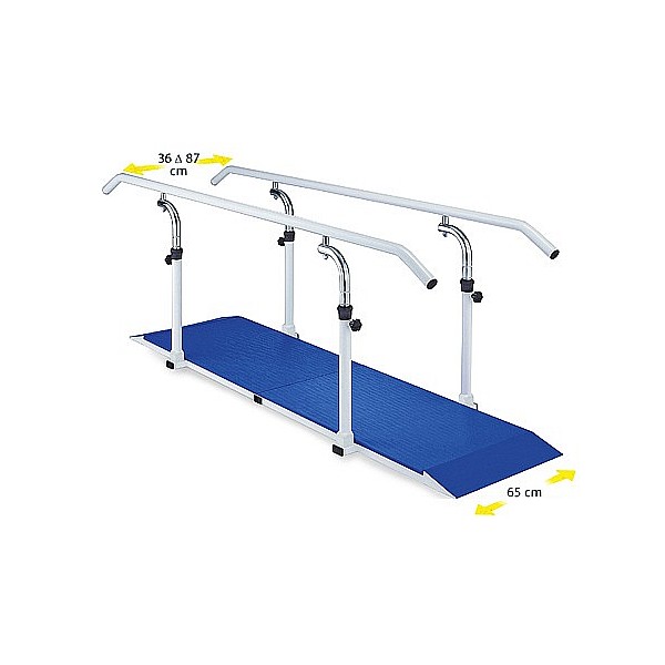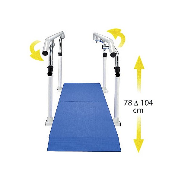 Solid, stationary steel frame construction with a plywood floor, which is equipped with a non-slip covering. Powder-coated, 360 ° rotating handle bars. Height adjustment: 78 - 104 cm, width adjustment: 36 - cm 87th Delivery disassembled in boxes.