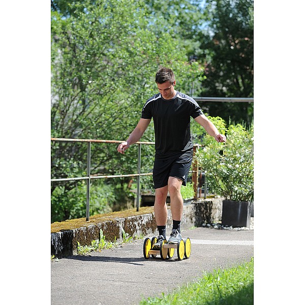 The basis of this versatile ERZI set is formed by two Rocky Rocker seesaws, which are made without nails and screws and already offer a lot of possibilities. The rockers have two different radii, which means that the degree of difficulty can be changed by simply turning the rockers upside down. The seesaws can be used as stools, sitting, kneeling or standing seesaws. When sitting or kneeling, the round rods serve to hold the children in place. The balancing boards that are part of the set can also be hooked into these round rods and so the two seesaws and one balancing board become a great balancing board. If you hang a balancing board in the middle of the seesaw, a swing for two children is created. With the 4 balancing boards, you can always create new paths with different requirements. The set also includes a wall bracket in which the balancing boards can be easily hung on the wall after use to save space. Made in Germany. The ERZI ROCKY balancing course consists of: 2 seesaws "Rocky Rocker", (LxWxH): 42 x 29 x 17 cm 1 "Senses" balancing board, (LxWxH): 186 x 22 x 8.5 cm 1 balancing board "Field stone", (LxWxH): 186 x 22 x 8.5 cm 1 "Ten" balancing board, (LxWxH): 186 x 22 x 8.5 cm 1 "Forest floor" balancing board, (LxWxH): 186 x 22 x 8.5 cm 1 wall bracket, (LxWxH): 50.6 x 12 x 6.7 cm Material: birch plywood, beech, clear lacquered Delivery carriage forward ex works!