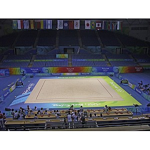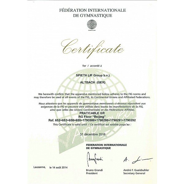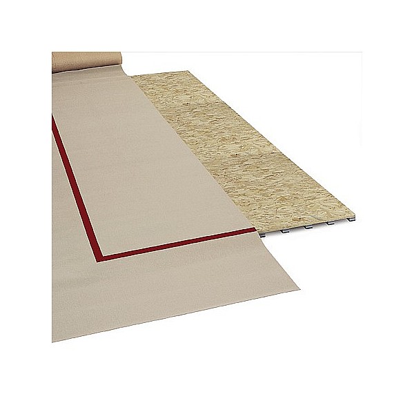 Savannah beige, certified FIG. Substructure shock absorbing. Consisting of 121 sheets, each 125 x 125 cm, as well as equalizing plates on the upper side - these are held together by Velcro. High force reduction achieved by special foam elements. Extremely smooth, high-quality anti-static carpeting Super Veloursmit high shear strength ensures optimal training and competition conditions. Incl. red tape to the mark.