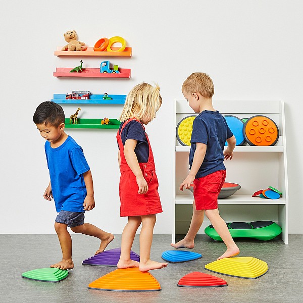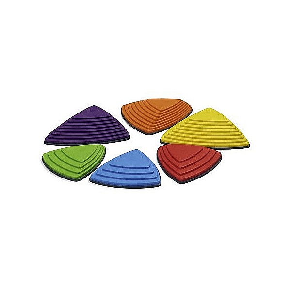 The improved design Flussteine ??mimic stones sculpted by hydropower. To achieve changing training effects, the three sides of the stones different angles of inclination. Working with the Balanciersteinen trained sense of balance, body awareness, motor coordination and motor skills. You can either play alone and in the group with the river stones. They are made of sturdy plastic with rubber edge, on the one hand prevents slipping and secondly protects the floor from scratches. The river stones are to be stored stacked and thus space-saving. Colors: yellow, blue, red, green, orange, purple. Maximum load 100 kg. Complete set with 3 large stones (W x L x H) 36 x 36 x 8.5 cm 3 small stones (W x L x H) 25 x 25 x 4.5 cm. Provided instructions