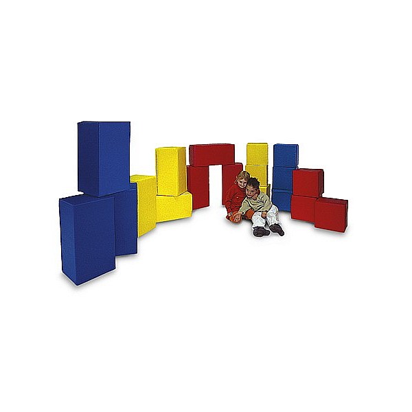 Colored light canvas material, rigid foam core. Edge length of 30 cm, consisting of various blocks.