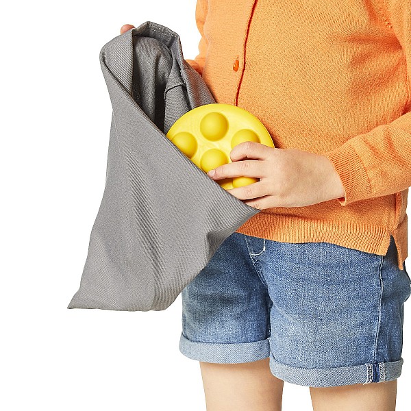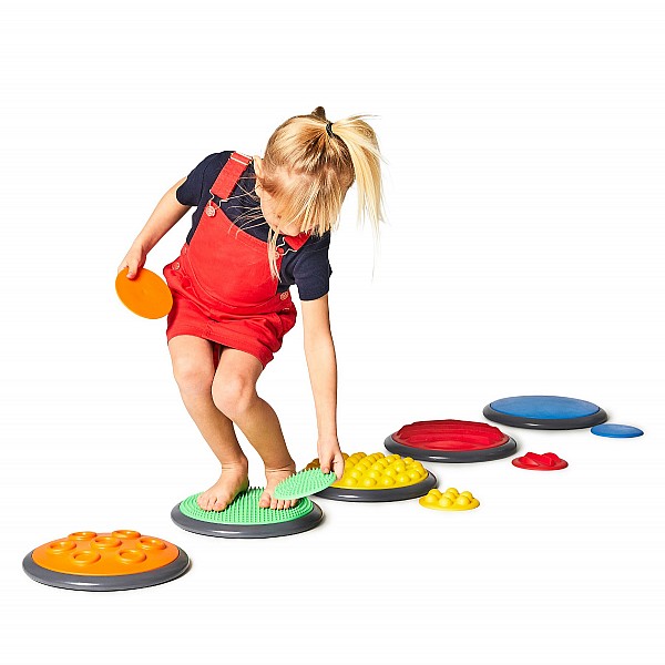 The disks promote the sense of touch of children hands and feet. 5 large (Ø 27 cm) discs with rubber covering on one side and 5 small discs (diameter 11 cm) made of rubber. including in 5 different colors and textures in the bag. a blindfold.