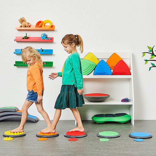 The discs demanding the sense of touch of children hands and feet, at the same time the ability is encouraged to describe sense impressions verbally. The tactile discs made of comfortable non-slip synthetic rubber show different structures, each in a different color. Each structure can be found on a large discs, which is placed on the ground, and is held in the hands of a small disk. Many ways to play with different content? Sensory perception tactile structures, memory and recognition games blindfolded? which can be adjusted according to age and promotion areas. Large disc 27 cm in diameter, small slices of 11 cm diameter. Capacity up to 100 kg.