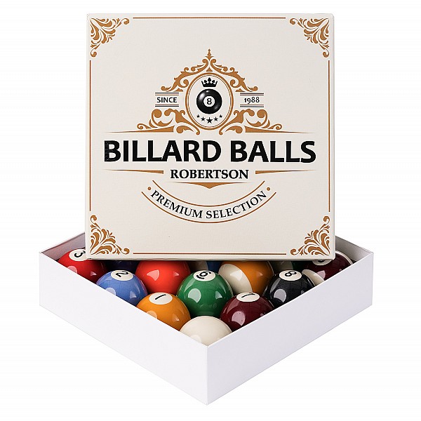 ROBERTSON billard balls meet the specifications with exactly 57.2 mm millimeter diameter and a weight of 170 grams. These balls have been tested for quality and safety of raw materials and components by SGS. The eye-catching intense coloring with the large number rings make the balls uniquely beautiful.