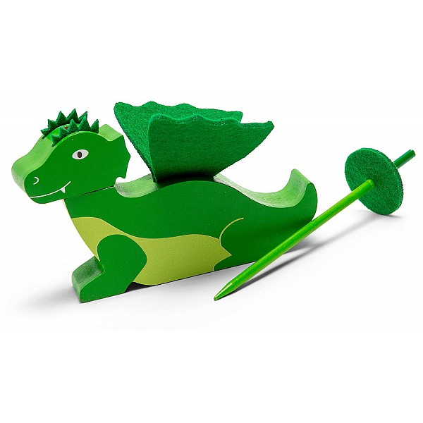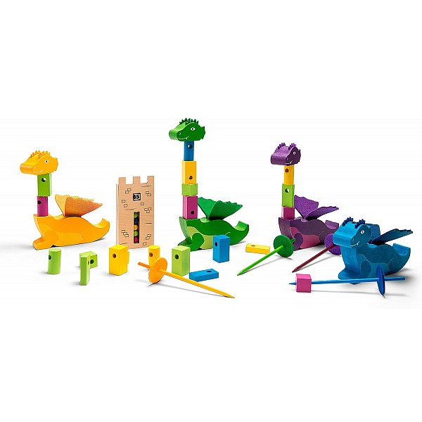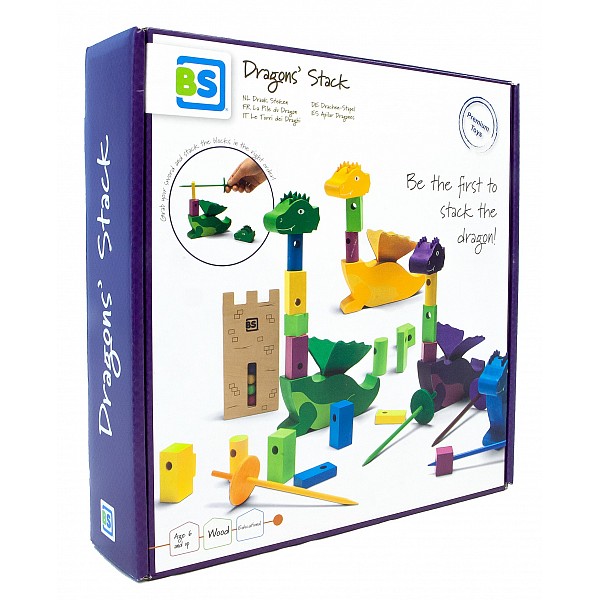 The game - Stack the Dragon is about using the swords to build his kite as quickly as possible, without it falling over. At the beginning of the game, the tower is rotated and shaken several times. After the tower is put down, the color discs inside are in a certain order which can be seen on the window. According to this random color sequence, the wooden pieces for the neck with the swords must now be impaled and stacked. Finally, the head is stacked. Whoever succeeds first without the neck falling over wins the game.