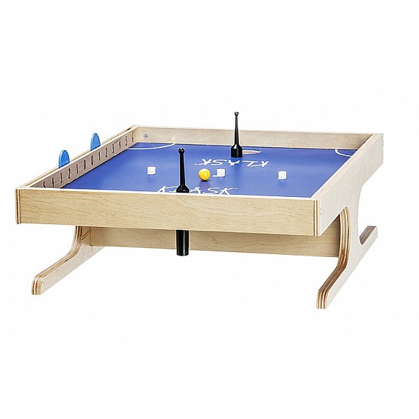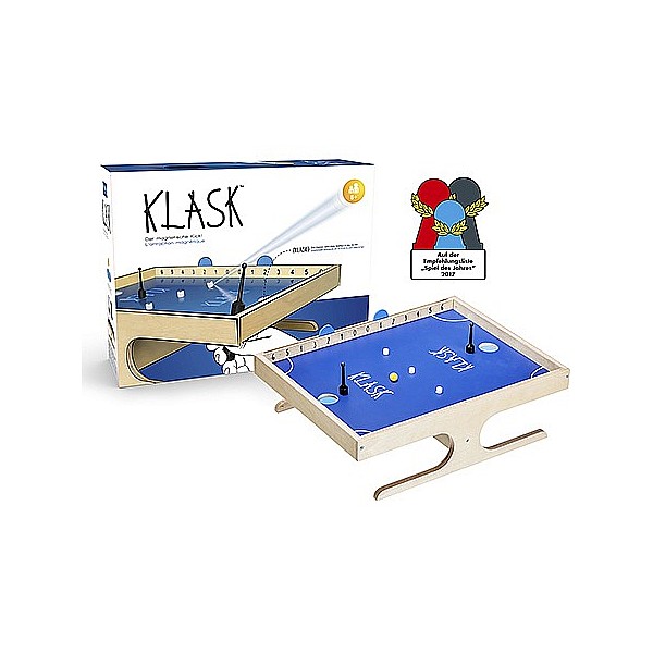 Busting klask: the two players each move a figure on a 30 by 40 centimeter pitch. they control this figure with a magnet, which is located under the playing field. The aim of the game is the ball in goal an opponent accommodate. The door consists of a hole of about three centimeters in diameter. Special voltage bring three more white magnets on the field. If a player moves all three magnets with his character on his opponent receives one point. The name Klask incidentally, comes from the Danish and the German gossip to translate. blue, (L x B x H) 45 x 34 x 13 cm, 1.66 kg of wood, plastic, magnets. Game of the Year 2017 Players use the magnetic handles the board to the in-game items to control on the surface. The aim of the game is to sink the ball in the opponent's goal without touching the small white magnet or to obtain an own goal You need nimble hands and have to think fast to the game to decide for themselves. Playing time: 10-20 minutes | Recommended age: From 8 years |