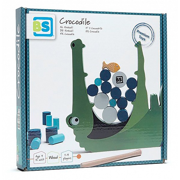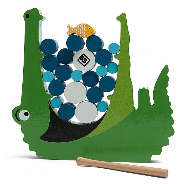 Funny designed skill game made of lacquered wood, for training motor skills. After the game is built, in the mouth of the crocodile are blue, light blue and gray tiles, which are to represent bubbles. On top is a yellow fish as crocodile food. Now you have to push out these bubbles one after the other with the wooden stick, so that finally the yellow fish lands in the crocodile's mouth. Depending on the color, different points are awarded for the bubbles that are pushed out. The player with the most points wins. But be careful - if the fish falls down before all bubbles are pushed out, the game is automatically lost.