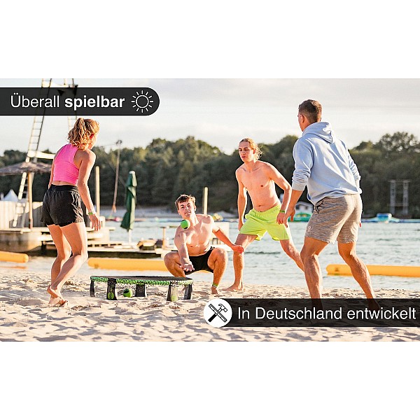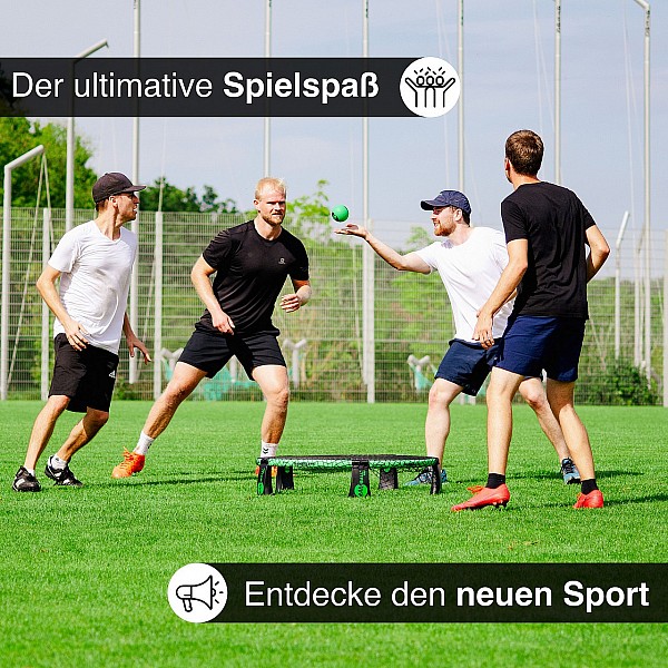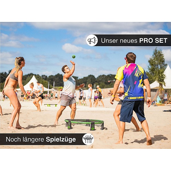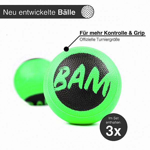 The BamBall Roundnet Pro Set is perfect for those seeking an exciting and interactive leisure game. It is the ideal choice for 2-on-2 roundnet games, similar to volleyball, in schools, clubs, indoors, or outdoors. The set includes 5 frame pieces, 5 Pro legs, 3 Pro balls, a pump, a waterproof backpack, game rules, a net, a ball pressure gauge, stickers, and optionally a school teaching concept. The sturdy frame pieces provide a stable construction, while the new balls with improved material and grip ensure a better gaming experience. The backpack offers ample space for everything, and the set is versatile in its applications. Dive into the thrilling game with the BamBall Roundnet Pro Set!