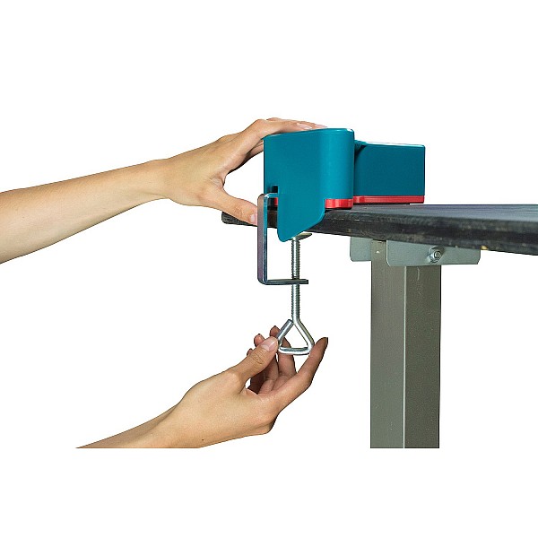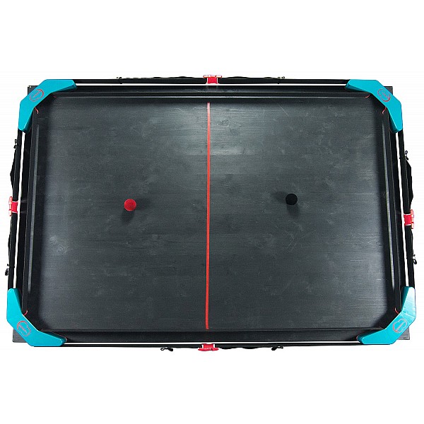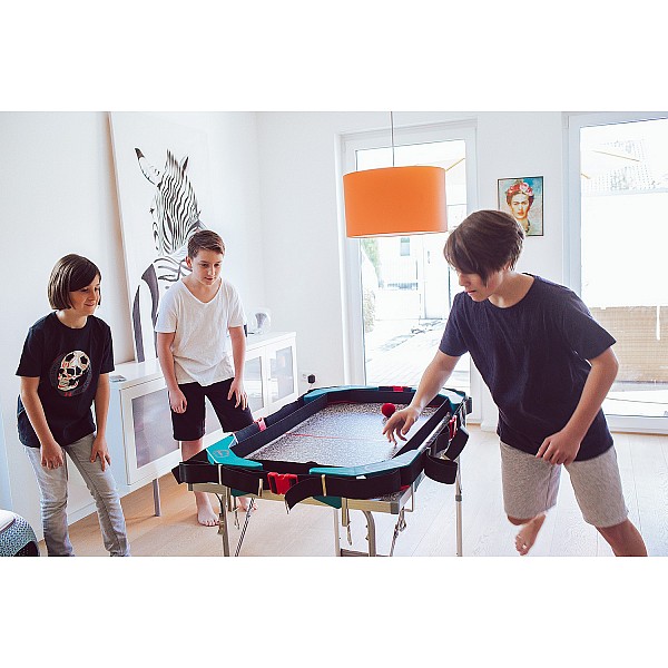 The playing field is quickly and easily assembled. By means of the supplied clamping screws, the gate corner parts can be attached to the table. Between these goals, a belt is stretched. This should be quite tight, so that the 2 game balls can bounce off it.