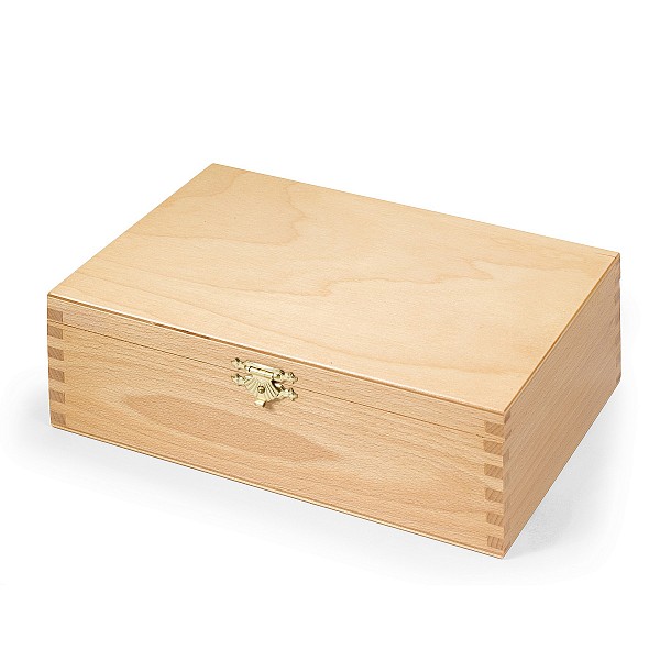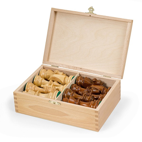 Staunton form, tournament suitable, boxwood, brown / nature, polished with felt and lead, King height 8.9 cm, in beech cassette.