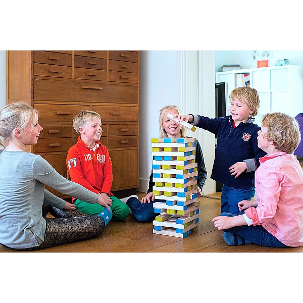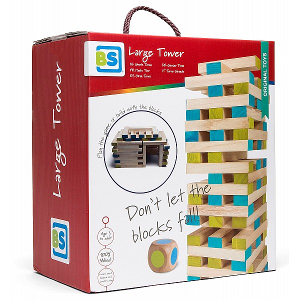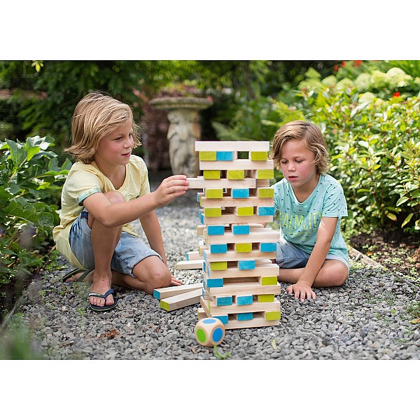 The well-known wooden stacking tower in an XXL version. The height of the tower is a maximum of 1 meter. The game is played with the enclosed wooden dice, which has colored areas instead of eyes, dice and the diced color indicates which wooden blocks you have to pull out of the tower and put back on top. Of course, the tower must not fall over, otherwise you lose the game. The wooden blocks are of course also excellent as building blocks.