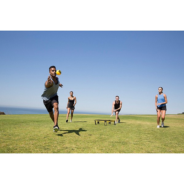 Spikeball reaction game "Pro" offers high stability thanks to its resistant frame construction and is therefore ideal for intensive and frequent play. The frame parts are made of unbreakable plastic, which results in a torsion-free construction. Unlike the classic spike ball, the frame is oval. The frame is in an eye-catching yellow signal color to ensure good visibility. The net is dimensionally stable and tear-resistant and can be attached to the bottom edge of the frame thanks to the solid hooks. The new hooks and optimized frame allow for greater tension on the net.