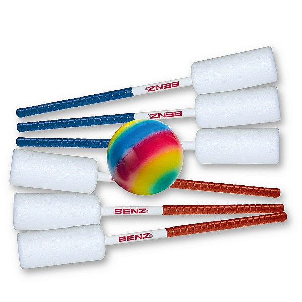 Action-packed game with broad applications (similar to speed play), to therapeutic, educational and psychologically valuable. The racket lobes are made of durable polyurethane foam, the handles made of PVC-tube. A game for young and old, whether for club, school, family or disabled therapy. The set consists of three red bats, 3 blue bats. The bats are made of sturdy plastic rods with foam lobes, each 86 cm long. Including PVC ball Ø 23 cm.