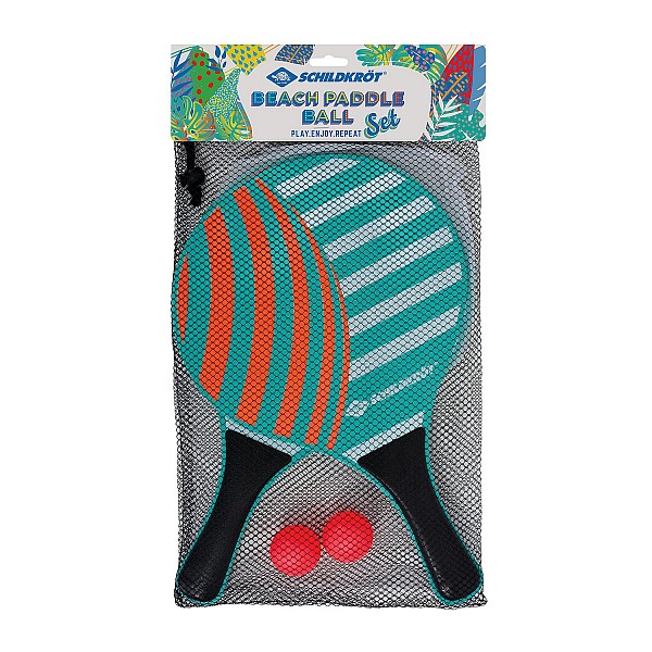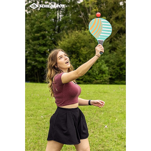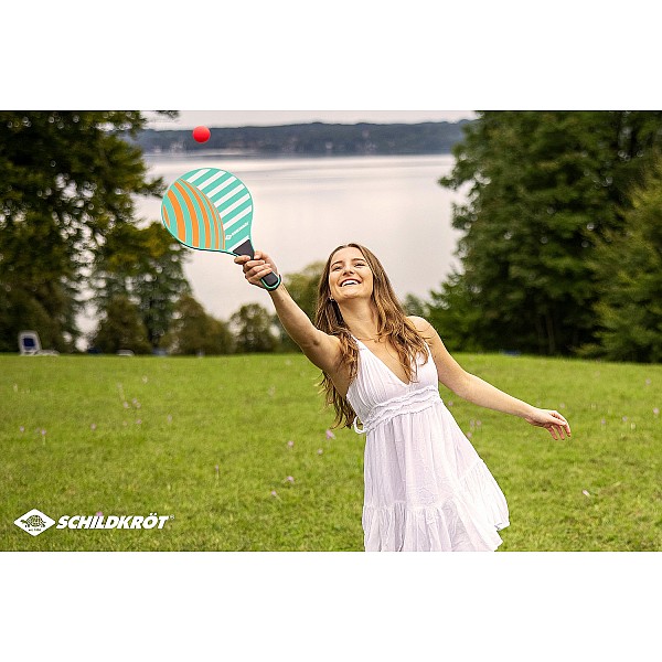 With the Ocean beach ball set from Schildkröt, recreational fun for the whole family is guaranteed. Whether on the beach, in the garden, on vacation, on the volleyball court or soccer field. The Beach Ball Set is made of high quality 8 mm thick wood and includes, in addition to the bats, two balls made of plastic. The set is packed in a resealable mesh bag.