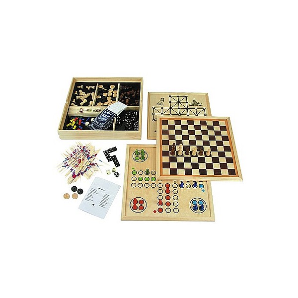 Games made of wood with 10 options: chess, checkers, mill, Backgammon, Ludo, Chinese checkers, solitaire, Fuchs + Henne, Mikado, dominoes and playing cards. Size: 36 x 36 x 6.5 cm.