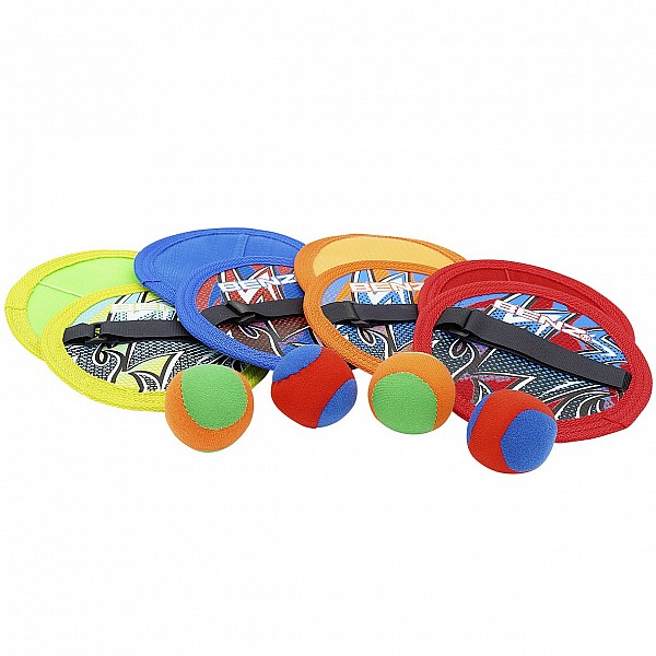 Catching and throwing fun at the beach, in the home garden or in nature. With this catch ball game, not only is fun guaranteed, you also train your eye-hand coordination as well as your reaction skills. The soft velcro ball set is particularly suitable for children from 3 years of age due to its low weight. With the help of the width-adjustable hand straps, the velcro ball hand catchers can be adapted to any hand size. Details: 2x neoprene Velcro handcatchers with width-adjustable hand strap; diameter Velcro handcatcher: approx. 18.5 cm; colour Velcro handcatcher: green / blue; 1x Soft Velcro ball; diameter Soft Velcro ball: approx. 6.25 cm; colour Soft Velcro ball: green / orange; Especially suitable for children from 3 years. Supplied in assorted colours according to stock!