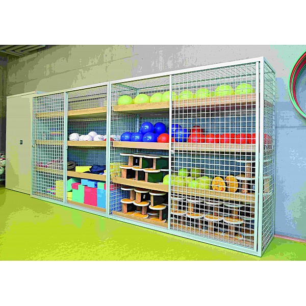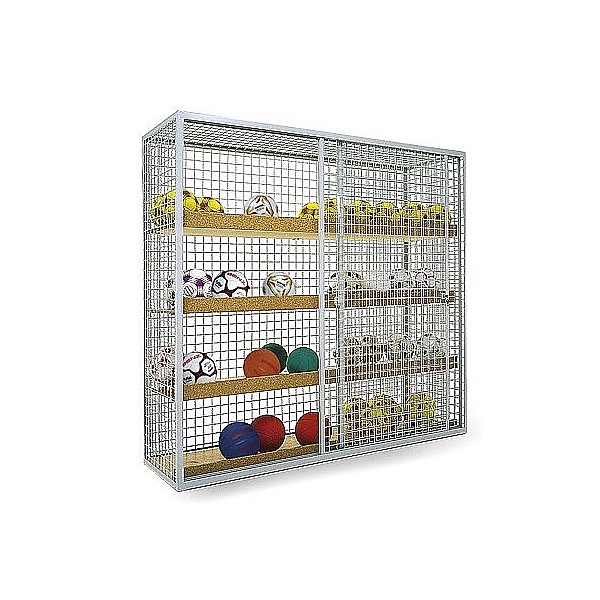 Wave grille design, more stable, welded angle iron frame, two roller-mounted sliding doors with wire mesh filling. Optimum ball ventilation and wet balls. Double closing security lock, adjustable wooden shelves. Color: RAL 7035 light gray. Dimensions (W x H x D): 200 x 186 x 60 cm.