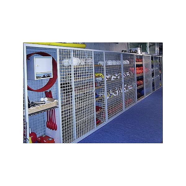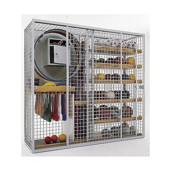 Woven wire mesh, painted, roller-mounted sliding doors with double closing security lock. One half with storage device for gymnastics ropes, tires and clubs. Extra lockable security compartment. Storage for small parts and accessories. Second half with adjustable wooden shelves as storage for balls, etc. Dimensions (W x H x D): 200 x 186 x 60 cm.