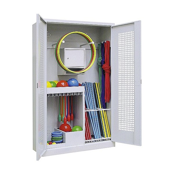 Universal Ball Cabinet / equipment cabinet: strong> double doors with security lock Including lockable, mounted in the cabinet, security locker suspension for gymnastics tires up to 8cm Ø diameter Optimal appropriate storage for small / & handsets UL> door color choice of 6 colors: strong> yellow orange (RAL 2) ruby (RAL33) Lichtblau (RAL512) gentian blue (RAL51) light gray (RAL 735) (standard color) Black gray (RAL721) UL>