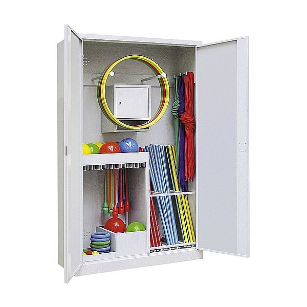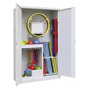Universal Ball Cabinet / equipment cabinet: strong> double doors with security lock Including lockable, mounted in the cabinet, security locker suspension for gymnastics tires up to 8cm Ø diameter Optimal appropriate storage for small / & handsets UL> door color choice of 6 colors: strong> yellow orange (RAL 2) ruby (RAL33) Lichtblau (RAL512) gentian blue (RAL51) light gray (RAL 735) (standard color) Black gray (RAL721) UL>