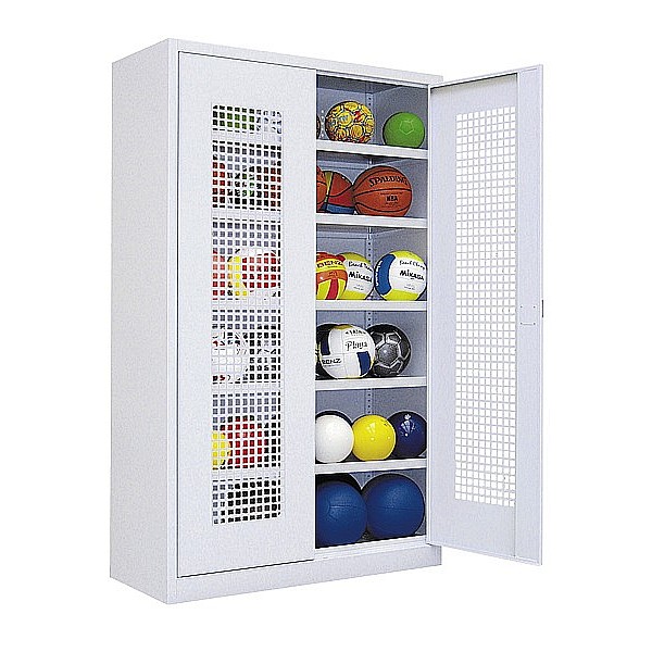 Benz sports equipment enclosure type 1, grille-wing doors The original - in BENZ-equipment cabinet type 1. Details: p> wing doors made of perforated sheet with security lock body Color gray, door color choice of 6 colors External dimensions 195 x 120 x 50 cm (H x W x D) 90 kg UL>