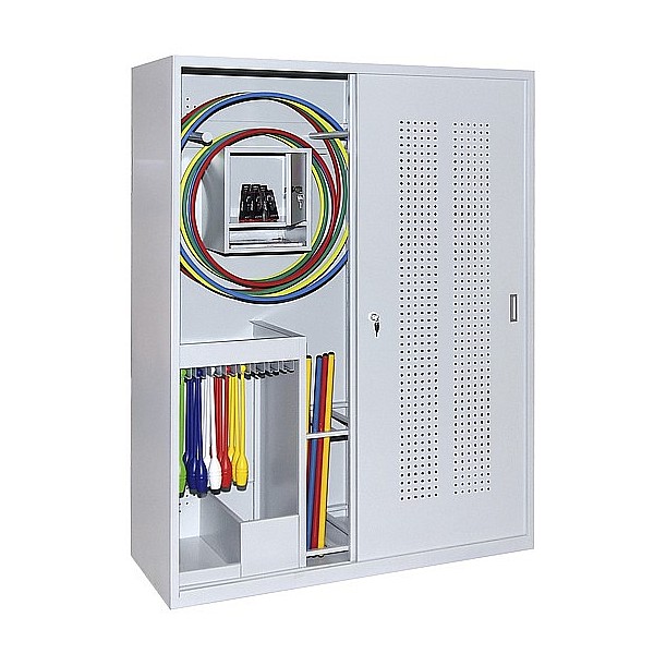 Universal Ball Cabinet / equipment cabinet: strong> sliding doors with security lock Includes 4 adjustable steel shelves in the right half of the cabinet Optimal suitable storage solution for small / & handsets UL> door color choice of 6 colors: strong> yellow orange (RAL 2) ruby ??(RAL33) Lichtblau (RAL512) gentian blue (RAL51) light gray (RAL 735) (standard color) Black gray (RAL721) UL>