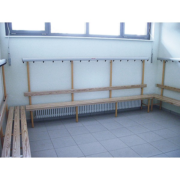 Embodiments in good wood-aluminum steel construction. The feet are made of precision round steel tube and by default painted blue gray RAL 7031st For soil conservation feet with PVC-gliders are provided. The anodized aluminum profile hook bars are fitted with unbreakable plastic hooks or with shapely stainless steel double hook, about 5 pieces per meter. The hooks are attached according to the safety of the BUK. Seat and back strips are painted solid wood colorless. The front support rail is additionally equipped with an attached cover strip. Double-sided, total width 76 cm, height 45 cm, total height of 152 cm. Each seat 3 bars and a back bar coat hanger as described. per cm