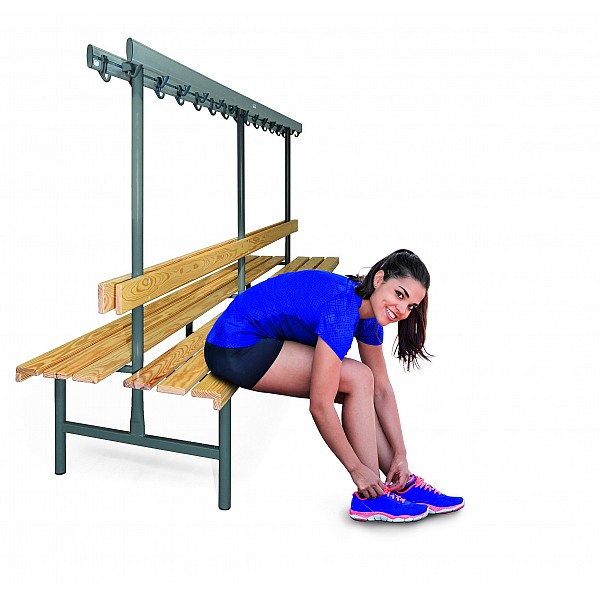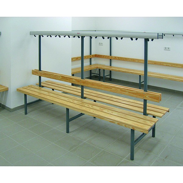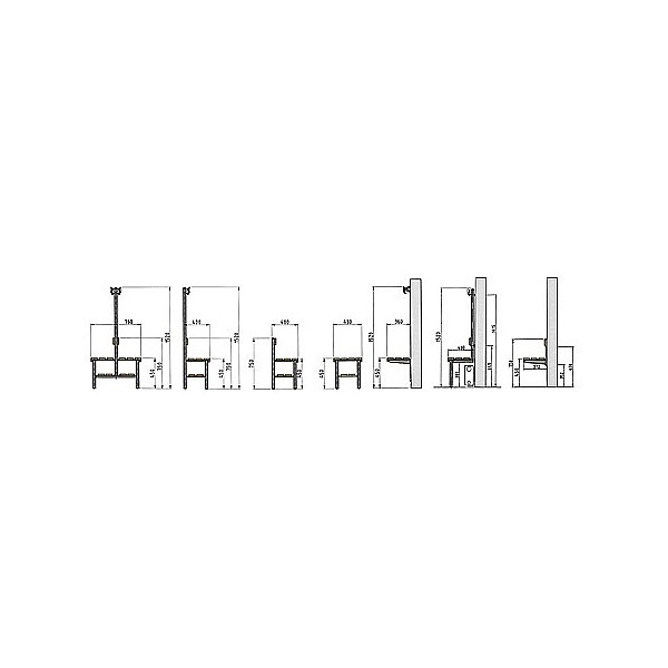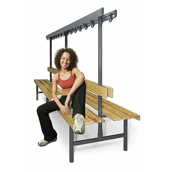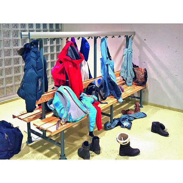 Embodiments in good wood-aluminum steel construction. The feet are made of precision round steel tube and by default painted blue gray RAL 7031st For soil conservation feet with PVC-gliders are provided. The anodized aluminum profile hook bars are fitted with unbreakable plastic hooks or with shapely stainless steel double hook, about 5 pieces per meter. The hooks are attached according to the safety of the BUK. Seat and back strips are painted solid wood colorless. The front support rail is additionally equipped with an attached cover strip. Double-sided, total width 76 cm, height 45 cm, total height of 152 cm. Each seat 3 bars and a back bar coat hanger as described. per cm