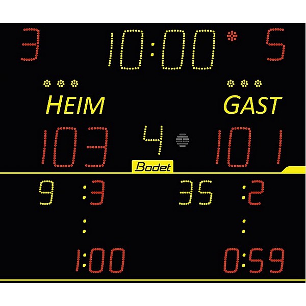 Display panel 8015 ALPHA, Bodet, incl. Scorepad control panel, with power supply and an emergency battery, running time control panel without power supply 15 min., Black body, (B x H x D) 120 x 70 x 6.55 cm, 25 kg of yellow and red LED numeric display, of 13 digits, character height 10 and 15 cm, displaying the team name, the display m playing time or time, display the scores and error team, display of time-outs, visibility 60, radio-controlled. Unfree from Herstellerwerk.Bauseitige power: electric supply, electrical connection and operation switches Scorepad long battery 4h operational time, included free of charge.