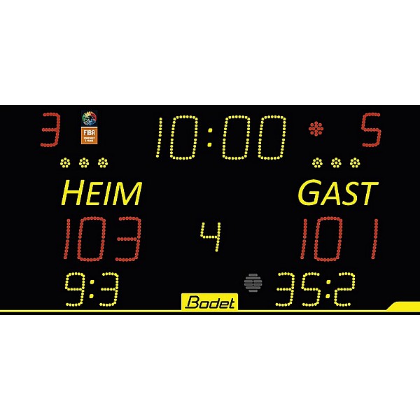 Display panel 8015 ALPHA, Bodet, incl. Scorepad control panel, with power supply and an emergency battery, running time control panel without power supply 15 min., Black body, (B x H x D) 120 x 70 x 6.55 cm, 25 kg of yellow and red LED numeric display, of 13 digits, character height 10 and 15 cm, displaying the team name, the display m playing time or time, display the scores and error team, display of time-outs, visibility 60, radio-controlled. Unfree from Herstellerwerk.Bauseitige power: electric supply, electrical connection and operation switches Scorepad long battery 4h operational time, included free of charge.