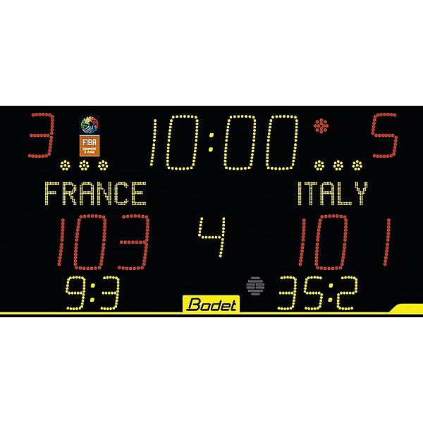 Bezel 8T125 ALPHA, Bodet, incl. Scorepad control panel, with power supply and emergency battery runtime control panel without power supply 15 min., Black housing (WxHxD) 200x100x6,55 cm, 50 kg, yellow and red LED digits, displaying 21 digits, Character height 20 and 25 cm, the elapsed playing time or time, display of time-outs, countdown including penalty time, display of the team faults, visibility 120 m, radio-controlled, safety plug, FIBA certified level 2, Unfrei from Herstellerwerk. On-site performance: electric supply line , electrical connection and operation switches