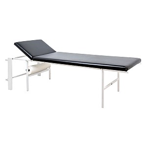 The foldable recliner offers a space-saving solution for small rooms. Thanks to the uncomplicated folding and holding mechanism, the recliner is kept ready on the wall and is ready for use in just a few steps. The folding holder is to be screwed to the wall according to the couch height. The upholstery is made of 4 cm thick foam with hard-wearing imitation leather cover in black. The headrest can be adjusted in several stages. A roll-off device for a medical crepe is integrated in the powder-coated frame. The folding and holding device consists of a mounting frame, two mounting running bolts for fastening the couch to the mounting frame and a fastening angle with safety lever.