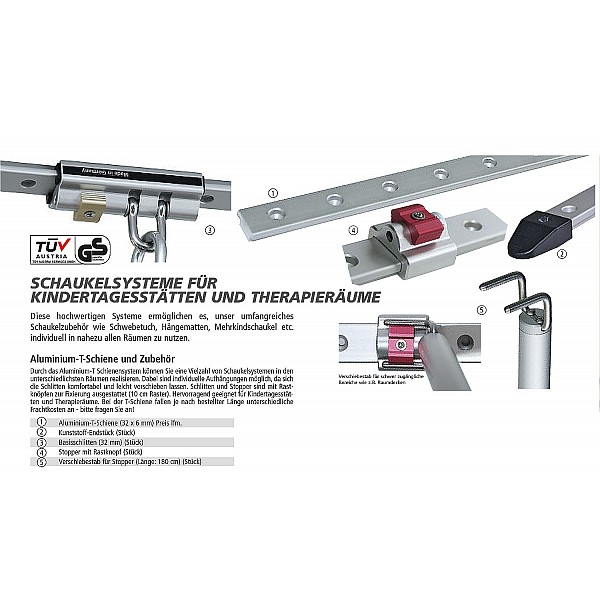 Through the aluminum T rail system you can implement a variety of swing systems in a variety of areas. Here individual suspensions are possible because the carriages can move comfortably and easily. Carriage and stopper are provided with locking studs for fixing (10 cm height). Excellent for day care and therapy rooms. Price per linear meter. Comment: The track itself is a very flexible system and has proven itself in our hall in the composite with two parallel rails much. A very worthwhile application. Through the rod to and from a greater distance to move the sled, the system is also suitable for high ceilings.