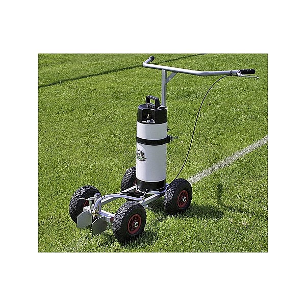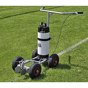 TYPE 704, for rulings with water-marking paint. Stable steel frame with high quality powder coating, small parts galvanized. 12 liter plastic paint container (for about 9 l highlight color) with a hand pump, pressure gauge and safety valve. Spraying front arranged operable by hand lever. Line width adjustable, 5 cm and 12 cm. 4 large balloon wheels, steering handle height adjustable. Dimensions: 80 x 52 x 86 cm, weight about 12 kg. .