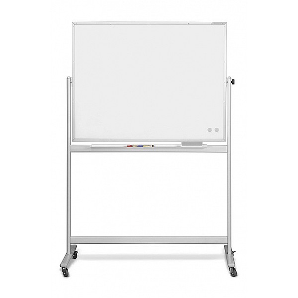Mobile frame swivel panel, 150 x 100 cm (W x H). Rotated 360 °, locked in any position with screw knob. With stable, circumferential aluminum frame on a light gray chassis 4 with smooth-running rollers 2 breaks. The varnished, magnetic surface is wet and dry wipe.