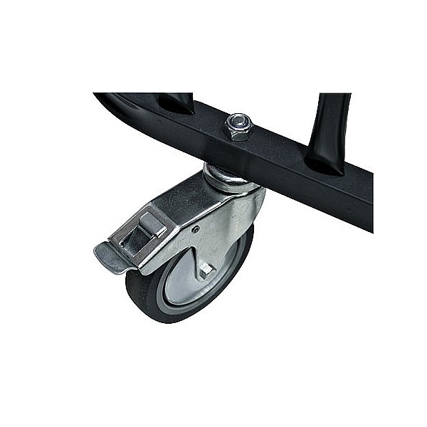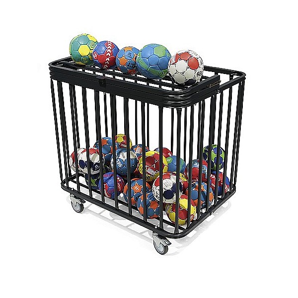 Frame in bracket construction, bars made of precision steel tubing, all metal parts scratch-resistant powder-coated, lockable with hinged lid. The ball trolley is easy to move thanks to 4 steerable, rubber-tyred wheels with ball bearings. It can be dismantled and is delivered disassembled, packed in a cardboard box. Dimensions (W x H x D): 94 x 90 x 75 cm.