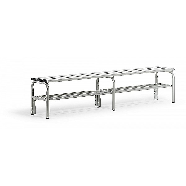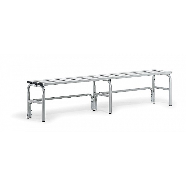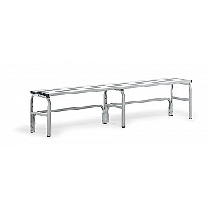 Systems standard bank stainless steel in a modular system, can be dismantled, pitch 2000 mm. Stable padlock stainless steel construction 25 x 25 mm, powder coated, light gray RAL 7035. Bußgelfüße with height adjustable glides to protect the floor and balance on uneven surfaces. Seat height 450 mm, mm seat depth 330th High comfort x 25 mm by 3 aluminum profiles 100, powder coated, light gray RAL 7035. backrests and hook strips are also powder-coated mm made of aluminum profiles 100 x 25, light gray RAL 7035. sealed tube ends with plugs. Fungi and bacteria, washable. Particularly suitable for wet rooms and outdoors. Benches endless screwed together.