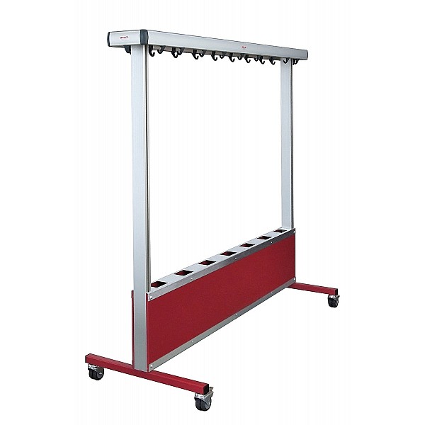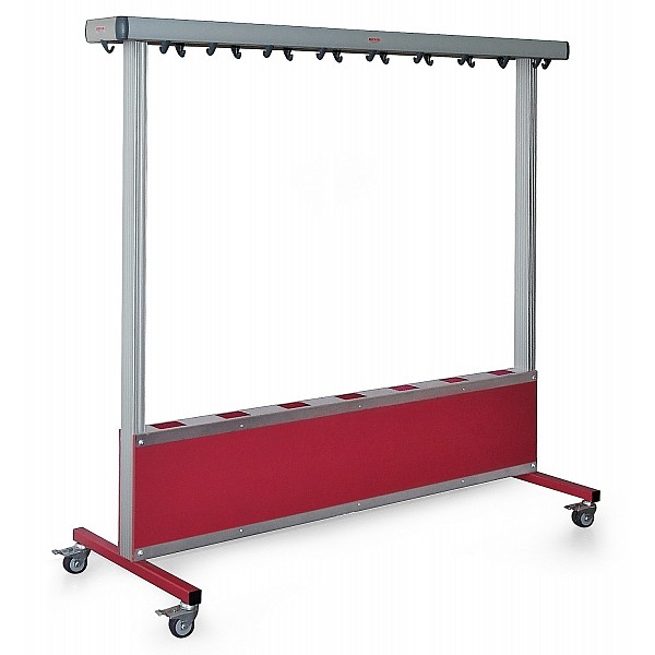 BENZ coat rack mobile with double-sided aluminum hook strips made of anodized, shapely, oval hollow aluminum profile. Plastic coat hooks concealed on both sides. The castors are equipped with brakes. The mobile solution for events, changing rooms or reception areas.