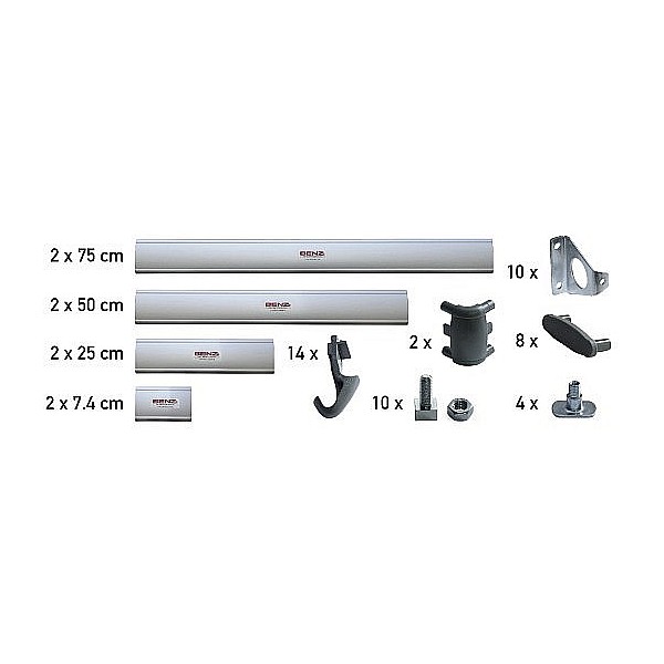 By combining the aluminum strips with the supplied corner joints and 90 degrees - solutions can be implemented. The tabs only be plugged into the profile and secured with enclosed plastic pins. The wall brackets are bolted to the profile and must (not included) to be fixed to the wall with suitable fastening materials. The kit consists of the following aluminum strips: 2 x 75 cm, 2 x 50 cm, 2 x 25 cm, 2 x 7.4 cm. 14 Garderobenhaken, 10 Wall holder 2 corner joints, end caps 8, mounting material for the wall brackets to the aluminum profiles and for the coat hook. Similar to picture.